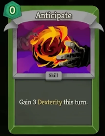 Anticipate — a Dexterity equivalent to the Ironclad's "Flex" — allows massive temporary bursts of Block power, encouraging perfectly timed defensive turns.